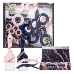 Framar „Holi-Yay Kit“ rinkinį kirpėjoms sudaro: plaukų dažymo šepetėliai, 2 vnt., segtukai plaukams, 2 vnt. ir folija plaukų dažymui, 50 vnt.