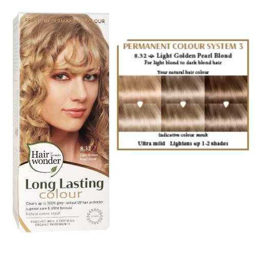 Ilgalaikiai plaukų dažai Hairwonder su 9 ekologiškais augaliniais ekstraktais, spalva šviesi auksinė perlinio atspalvio blondinė 8.32