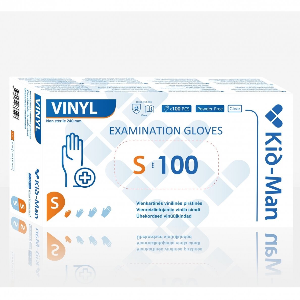 Vienkartinės vinilinės baltos pirštinės Kid-Man. Pirštinės yra be pudros, malonaus tekstūrinio paviršiaus, nesterilios, elastingos, lanksčios, pasižymi aukšta apsauga nuo daugelio cheminių ir infekcinių medžiagų. Pirštinės atitinka EN455, EN374, EN420 standartus. Dežutėje yra 100 vnt, dydis S.