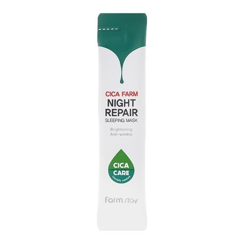 FarmStay Cica Farm Night Repair Sleeping Mask 4 ml – naktinė veido kaukė su Azijos centella, sukurta intensyviai atgaivinti ir nuraminti odą miego metu.