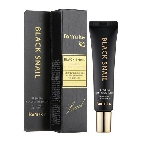 FarmStay Black Snail Premium Rolling Eye Serum – gaivinantis paakių serumas su sraigių gleivėmis, sukurtas mažinti raukšleles ir suteikti odai aplink akis jaunatvišką spindesį. Gelinė tekstūra greitai susigeria, o rutulinis aplikatorius suteikia masažą ir skatina geresnį produkto įsisavinimą.