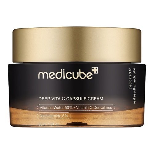 Medicube Deep Vita C Capsule Cream – tai kremas, kuris padeda atgaivinti papilkėjusią, nevienodo tono ir pavargusią veido odą. Dėl stiprios vitamino C koncentracijos priemonė akivaizdžiai šviesina pigmentines dėmes, suteikia odai gyvybingumo ir natūralaus švytėjimo. Formulėje esantis 5 % niacinamidas glotnina, mažina paraudimą ir pagerina bendrą odos būklę.